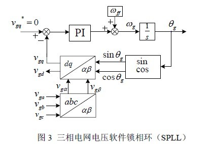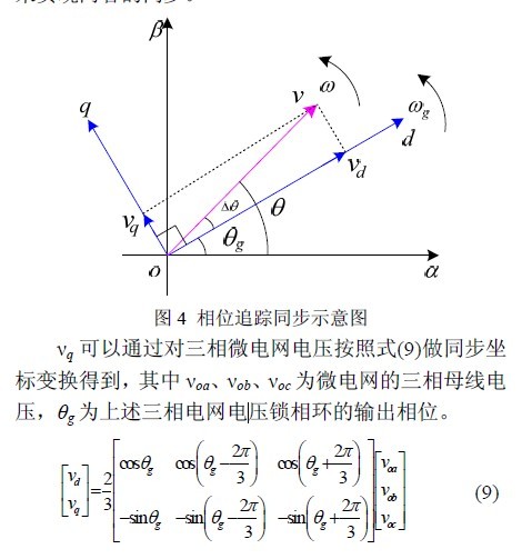 在上述電網(wǎng)電壓鎖相的基礎(chǔ)上,微電網(wǎng)電壓對(duì)電網(wǎng)電壓的同步追蹤過(guò)程如圖4 所示。圖中θg 和ωg 為大電網(wǎng)電壓的相位和角頻率,θ 和ω 為微電網(wǎng)母線電壓的相位和角頻率,Δθ 為兩者之間的相位差,d-q 坐標(biāo)系以電網(wǎng)電壓角頻率ωg 旋轉(zhuǎn)。同步追蹤過(guò)程就是通過(guò)調(diào)整微電網(wǎng)母線電壓的角頻率,使微電網(wǎng)母線電壓和大電網(wǎng)電壓之間的相位差Δθ 不斷趨向于零。當(dāng)兩者完全實(shí)現(xiàn)同步時(shí),應(yīng)該有Δθ 等于零,此時(shí)微電網(wǎng)母線電壓在q 軸分量上的投影為零,因此可以通過(guò)控制νq=0來(lái)實(shí)現(xiàn)兩者的同步。