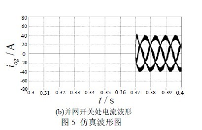 為驗(yàn)證上文所提并網(wǎng)預(yù)同步控制策略的有效性,用MATLAB/Simulink 搭建了微電網(wǎng)仿真模型,模型結(jié)構(gòu)如圖2 所示。圖5 為仿真結(jié)果。圖5(a) 為預(yù)同步過(guò)程中微電網(wǎng)電壓和大電網(wǎng)電壓的波形圖,可以看出兩者之間的相位差不斷減小,并最終實(shí)現(xiàn)同步。圖5(b)為并網(wǎng)前后,并網(wǎng)開(kāi)關(guān)處的電流波形,可以看出,在并網(wǎng)預(yù)同步控制的作用下,合閘時(shí)刻不存在沖擊電流。