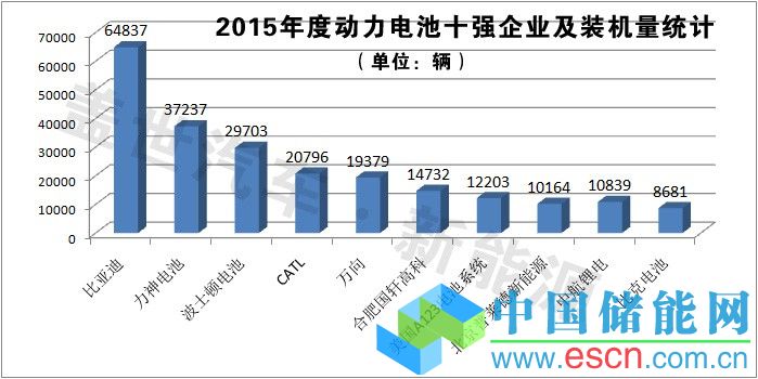 由圖表可以看出,此10家動力電池企業(yè)的裝機量總和為228571輛,占據(jù)2015年度新年能源汽車61.1%的市場份額。