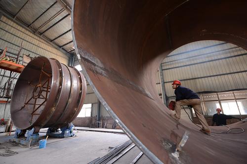 12月5日,江西洪屏抽水蓄能電站壓力鋼管制造廠,施工人員正在加緊施工。