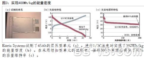 Envia在2010年報(bào)告說(shuō),20Ah的層壓型單元實(shí)現(xiàn)了250Wh/kg的能量密度。