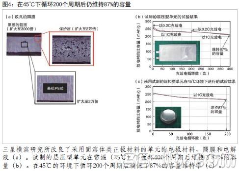 充放電循環(huán)特性方面,在常溫(25℃)下以1C的充放電速率循環(huán)400個(gè)周期后維持了87%的容量。另外,還采用紐扣型單元在45℃的高溫環(huán)境下實(shí)施了更加嚴(yán)格的試驗(yàn)。結(jié)果顯示,在充放電循環(huán)試驗(yàn)中,以1C的充放電速率循環(huán)200個(gè)周期后維持了87%的容量。“作為足夠耐用的鋰離子充電電池值得期待。”三星橫濱研究所認(rèn)為。