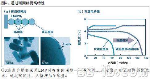 不過(guò),LMP存在的一大課題是,導(dǎo)電性比LFP低。GS湯淺通過(guò)用碳包覆LMP粒子,并構(gòu)筑連接LMP粒子的“碳網(wǎng)絡(luò)(Carbon Network)”提高了性能(圖6)。