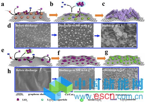在以上工作基礎上,研究人員通過一步法制備了碳化的密胺海綿-石墨烯-核殼結(jié)構(gòu)的鈷/一氧化鈷(Co/CoO)三維復合空氣電極。在此設計中,密胺海綿碳骨架賦予了電極高彈性和自支撐特性,并提供了石墨烯納米片的支撐框架;石墨烯納米片平整的二維結(jié)構(gòu)有利于Co/CoO的均勻負載和放電產(chǎn)物的跟蹤觀察;鈷前驅(qū)體的引入可提高石墨烯的還原程度,降低石墨烯對LiO2(Li2O2中間體)的吸附能。同時,Co/CoO作為高LiO2吸附能材料,可誘導Li2O2主要生長在Co/CoO顆粒表面,從而降低了石墨烯與Li2O2的接觸面,減少了發(fā)生在Li2O2/C表面的副反應,進而顯著提高了鋰空氣電池的電化學性能。這一設計為鋰空氣電池正極的構(gòu)筑和研發(fā)提供了新的思路和方法,并為多功能電極的制備提供了新的設計方案。該研究工作近期在線發(fā)表在Advanced Functional Materials (DOI: 10.1002/adfm201503907)上。
