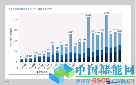 美國太陽能市場保持著破紀(jì)錄的發(fā)展勢頭,在2015年第三季度中新增裝機(jī)容量為1361兆瓦,在2015年太陽能市場前三個(gè)季度中提升了4.1吉瓦。得益于住宅太陽能市場的快速發(fā)展,2015年第三季度成為美國太陽能裝機(jī)容量連續(xù)增長的第八個(gè)季度,太陽能裝機(jī)容量增加超過1吉瓦。