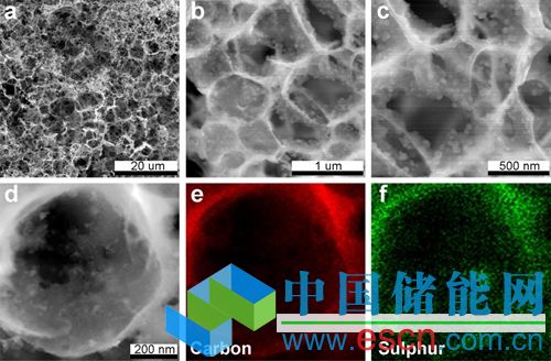 3D S@ PGC復(fù)合物形貌和元素分布:(a-c)為在不同放大倍數(shù)下的SEM圖片,(d-f)為TEM圖片及對應(yīng)形貌中C和S的分布