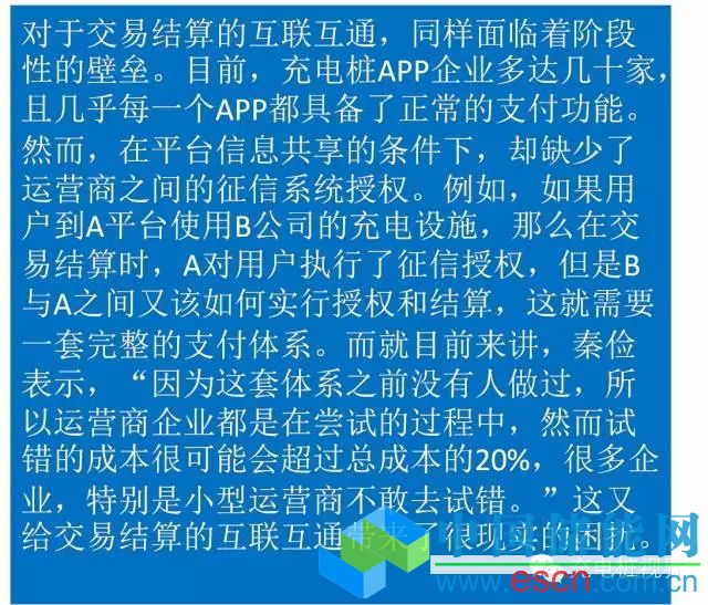 此外,對于交易結(jié)算互聯(lián)互通的解決辦法,童光毅提出,要建立運營商共同的支付體系,可以與金融機構(gòu)緊密合作,通過整體設(shè)計,制定一個可行的金融支付方案。對此,秦儉也認為,“最理想的方式就是依托現(xiàn)有的傳統(tǒng)金融支付方式,為運營商設(shè)計整體的支付流程,包括充電設(shè)施運營商之間如何授權(quán)等,先從兩三家達成協(xié)議后,進而各家逐漸形成統(tǒng)一的支付方式。”另外,他認為,“大型企業(yè)在支付系統(tǒng)的研發(fā)上較小型企業(yè)更具有資金優(yōu)勢。”