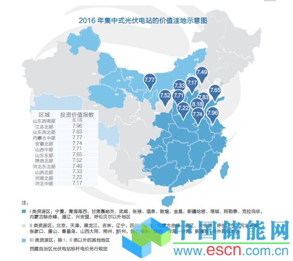 我國太陽能資源區(qū)分為三類,自2016年1月1日起,我國光伏標(biāo)桿上網(wǎng)電價(jià)執(zhí)行新標(biāo)準(zhǔn),I、II類資源區(qū)分別降低10分錢、7分錢,III類資源區(qū)降低2分錢。根據(jù)上網(wǎng)電價(jià)這一變量要素,利用投資價(jià)值指數(shù)公式計(jì)算可得出,上網(wǎng)電價(jià)的下調(diào),使三類資源區(qū)的投資價(jià)值顯現(xiàn)。