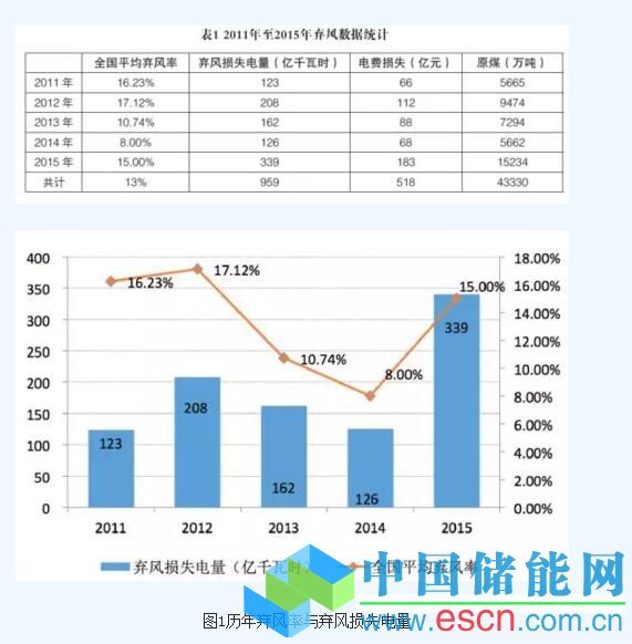 從統(tǒng)計來看,2011年至2015年我國棄風(fēng)電量累計損失達到959億千瓦時(三峽、葛洲壩兩座水電站在2015年的發(fā)電量一共是1048億千瓦時,2014年江西省一年的全社會用電量是1018億千瓦時)。近五年平均棄風(fēng)率達到13.4%,電費損失累計約518億元。相當于燒掉原煤4億多噸,僅2015年燒掉原煤1.5億噸。