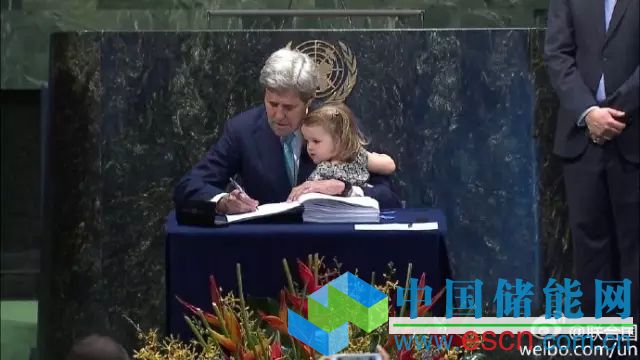 溫馨一刻:美國國務(wù)卿克里抱著自己的孫女上臺(tái),代表美國在《巴黎協(xié)定》上簽字。(來自@聯(lián)合國 官方微博)