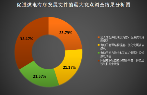 調(diào)查結果顯示,受訪人群普遍認為,煤電行業(yè)落后產(chǎn)能設定了淘汰標準,建立了風險預警機制,可有效促進煤電提質增效、避免出現(xiàn)裝機冗余現(xiàn)象、促進煤電行業(yè)更加合理地規(guī)劃建設。對于這份促進煤電有序發(fā)展文件的最大亮點,23.79%的受訪人群認為能夠加大落后產(chǎn)能淘汰力度,促進煤電提質增效;21.17%的受訪人群認為有助于能源結構調(diào)整,優(yōu)化發(fā)展清潔煤電;21.57%的受訪人群認為有助于地方政府和發(fā)電企業(yè)理性投資煤電項目;有33.47%的受訪人群認為能夠控制煤電項目規(guī)劃建設節(jié)奏,避免出現(xiàn)裝機冗余現(xiàn)象。(調(diào)查結果如下圖所示)