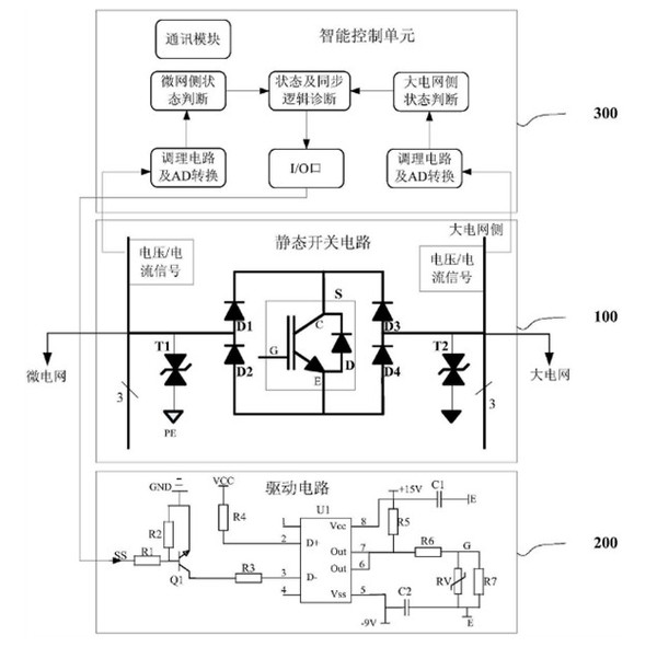 一種微電網(wǎng)用柔性并離網(wǎng)切換裝置由靜態(tài)開關(guān)電路、驅(qū)動(dòng)電路及智能控制單元組成。靜態(tài)開關(guān)電路是切換裝置的硬件主體;采用全控型半導(dǎo)體器件IGBT實(shí)現(xiàn)快速通斷;并通過IGBT模塊與四個(gè)二極管的排列實(shí)現(xiàn)其對雙向電壓與電流的阻斷能力;在微電網(wǎng)及大電網(wǎng)的交流母線上均裝有浪涌吸收抑制器件,避免IGBT過壓失效。驅(qū)動(dòng)電路采用光藕驅(qū)動(dòng);并實(shí)現(xiàn)控制信號(hào)與驅(qū)動(dòng)信號(hào)的隔離;通過+15V與-9V的驅(qū)動(dòng)電壓確保IGBT快速可靠通斷。