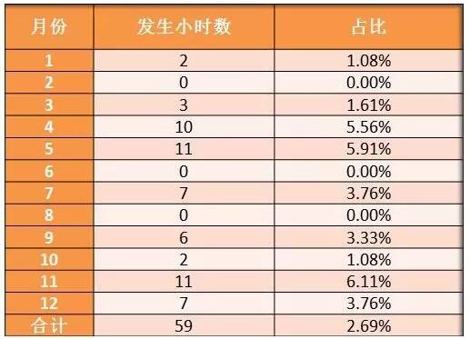 該風(fēng)電場(chǎng)2014年各月最大出力發(fā)生的時(shí)間為:1月、2月、5月、12月發(fā)生在19:00,3月發(fā)生在20:00,4月、9月發(fā)生在12:00,6月、11月發(fā)生在17:00,7月發(fā)生在23:00,8月發(fā)生在6:00,10月發(fā)生在1:00,即除4月、9月,其他各月最大出力均發(fā)生在光伏電站不發(fā)電或者發(fā)電很少的時(shí)間。