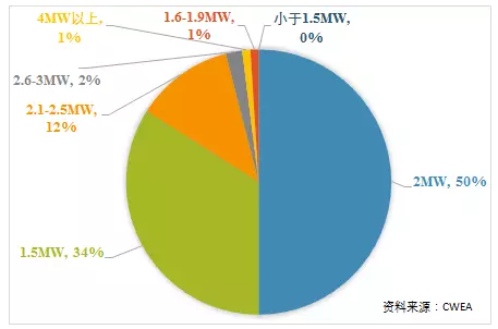 2015年新增裝機(jī)中,1.5MW機(jī)組和2MW機(jī)組占市場主導(dǎo)地位,市場份額達(dá)84%,2MW風(fēng)電機(jī)組裝機(jī)市場份額首次超過1.5MW機(jī)組,占全國新增裝機(jī)容量的50%。與2014年相比,1.5MW機(jī)組市場份額下降12個百分點(diǎn),而2MW機(jī)組所占市場份額上升9個百分點(diǎn)。2.1MW至2.5MW機(jī)組市場份額達(dá)到12%,其中主要是以2.5MW為主。2.6MW至3MW機(jī)組市場份額為2%,其他機(jī)組裝機(jī)占比在1%以下。