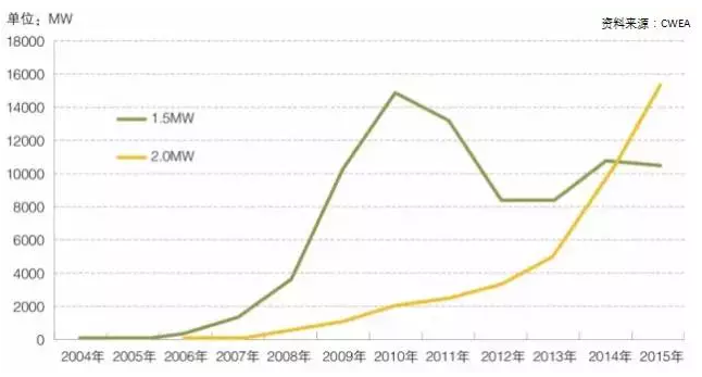 2004年至2010年,借勢我國風(fēng)電政策和風(fēng)電產(chǎn)業(yè)發(fā)展東風(fēng),1.5MW風(fēng)電機(jī)組得到快速發(fā)展,并成為主流風(fēng)機(jī)類型,在這期間2MW風(fēng)電機(jī)組則由于技術(shù)、成本以及市場需求等因素影響,發(fā)展較為平緩。2010年之后,經(jīng)過多年的技術(shù)和管理積累,加之國家對風(fēng)電產(chǎn)業(yè)發(fā)展的強(qiáng)力推動,2MW風(fēng)電機(jī)組增速顯著,并在2015年超越1.5MW風(fēng)機(jī),裝機(jī)超過1500萬千瓦。