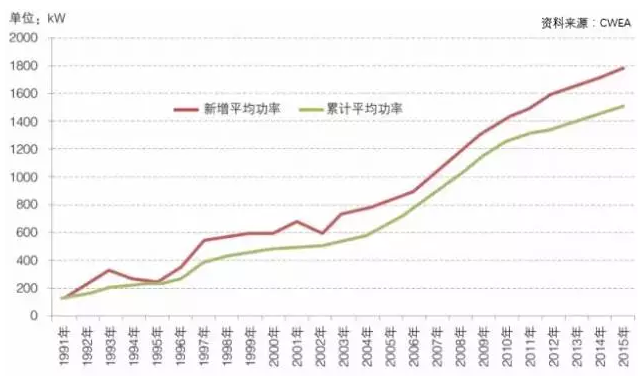 2015年,我國新增裝機(jī)的風(fēng)電機(jī)組平均功率達(dá)到1837kW,與2014年的1768kW相比,增長3.9%;累計裝機(jī)的風(fēng)電機(jī)組平均功率為1563kW,同比增長4%。如下圖所示,從1991年至2015年,我國風(fēng)電機(jī)組新增和累計平均功率均保持增長勢頭,且歷年新增平均功率均高于累計平均值,說明隨著風(fēng)電政策、市場、技術(shù)以及管理等的改善和提升,風(fēng)電機(jī)組一直向著增大功率方向發(fā)展,風(fēng)電的運(yùn)營效率也在逐年提升,這對于風(fēng)電市場的發(fā)展以及風(fēng)能替代具有重要推動作用。