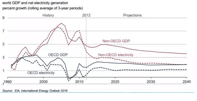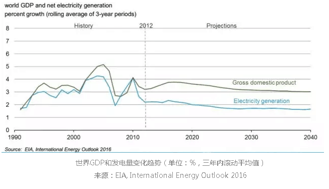 4.經(jīng)濟(jì)增長(zhǎng)推動(dòng)電力需求,電力消耗增長(zhǎng)率快于其他能源消耗,但是仍低于GDP。