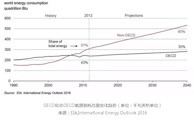 世界能源消耗將會(huì)從2012年的549千兆英熱單位(Quadrillion Btu)到2020年增加到629千兆英熱單位,到2040年增加到815千兆英熱單位,增幅48%,平均1.4%/年。非OECD亞洲國(guó)家(包括中國(guó)和印度)占據(jù)增幅的一半。