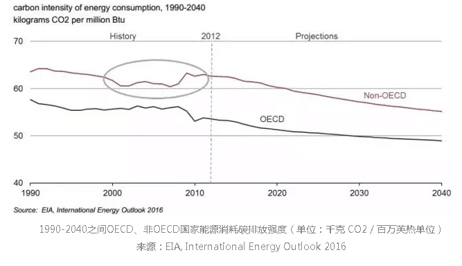 7.OECD和非OECD國(guó)家能源消耗的碳排放強(qiáng)度(CO2/E)到2040年呈降低趨勢(shì),非OEDC國(guó)家CO2/E在2000-2012年期間有所增加。