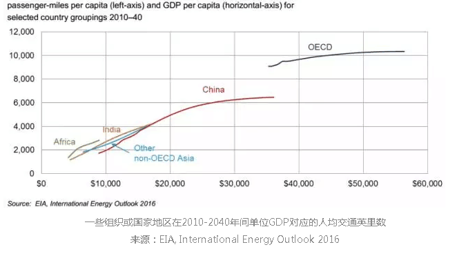 2.單位GDP對(duì)應(yīng)的人均交通英里數(shù)在增加,尤其是非OECD國(guó)家交通耗能增長(zhǎng)巨大。