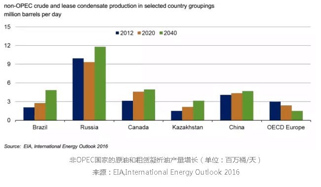 5.除美國(guó)外,其他非OPEC國(guó)家原油供應(yīng)增長(zhǎng)主要來(lái)自巴西、俄羅斯、加拿大和哈薩克斯坦。