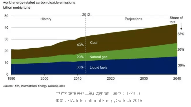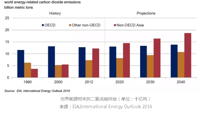 在當(dāng)前的政策和規(guī)定情況下,世界范圍內(nèi)能源相關(guān)的二氧化碳排放將從2012年的320億噸增加到2020年的360億噸,到2040年為430億噸,增幅為34%。