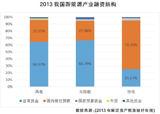 首先,融資方式較少。從融資渠道來(lái)看,新能源項(xiàng)目資金主要來(lái)源于企業(yè)自有資金和國(guó)內(nèi)貸款。2013年,自有資金和國(guó)內(nèi)貸款在風(fēng)電、太陽(yáng)能、核電項(xiàng)目融資結(jié)構(gòu)中的比例分別達(dá)到96.11%、94.77%和95.57%。由于新能源企業(yè)上市門檻較高以及我國(guó)債券市場(chǎng)發(fā)展相對(duì)滯后,直接融資僅占資金來(lái)源的10%左右。而多數(shù)風(fēng)險(xiǎn)投資機(jī)構(gòu)對(duì)新能源項(xiàng)目的投資尚處于探索階段,投資規(guī)模較小。從融資工具來(lái)看,國(guó)內(nèi)金融結(jié)構(gòu)匹配新能源產(chǎn)業(yè)的融資產(chǎn)品體系較不完善,新型抵押擔(dān)保、信托、可轉(zhuǎn)債、互聯(lián)網(wǎng)融資等創(chuàng)新融資工具應(yīng)用較少。