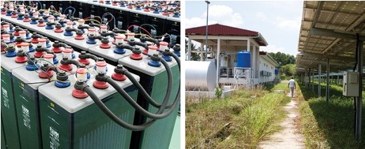 在丹戎巴都勞勿鎮(zhèn)附近,一大排太陽(yáng)能板(右圖)把電儲(chǔ)存到建筑內(nèi)部的一列鉛酸蓄電池(左圖)中。柴油發(fā)電機(jī)坐落在平臺(tái)上,和太陽(yáng)能板以及蓄電池一起組成了微電網(wǎng)電站。