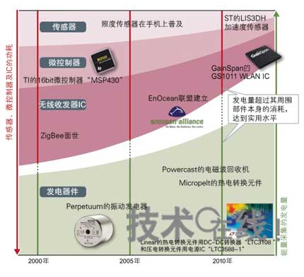 | 圖3 發(fā)電量超過(guò)本身的消耗 在發(fā)電器件性能提高的同時(shí),其周邊部件的耗電量正穩(wěn)步下降。尤其在在耗電量最大的無(wú)線收發(fā)IC領(lǐng)域,擁有很高技術(shù)實(shí)力的風(fēng)險(xiǎn)企業(yè)的面世具有重要意義。 |