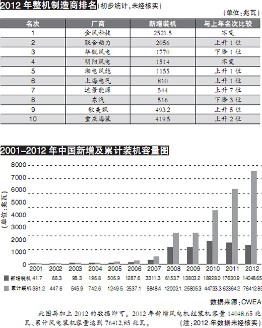 中國(guó)風(fēng)能協(xié)會(huì)的初步統(tǒng)計(jì)顯示,目前統(tǒng)計(jì),2012年排名前十五的風(fēng)電整機(jī)制造商分別為:金風(fēng)科技(2521.5兆瓦),聯(lián)合動(dòng)力(2056兆瓦),華銳風(fēng)電(1770兆瓦),明陽(yáng)風(fēng)電(1514兆瓦),湘電風(fēng)能(1155兆瓦),上海電氣(810兆瓦),遠(yuǎn)景能源(544兆瓦),東汽(516兆瓦),歌美颯(493.2兆瓦),重慶海裝(419.5兆瓦),維斯塔斯(414.4兆瓦),南車(chē)風(fēng)電(366.45兆瓦),運(yùn)達(dá)風(fēng)電(364.5兆瓦),華創(chuàng)風(fēng)能(296.4兆瓦),許繼風(fēng)電(172兆瓦)。