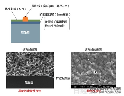 所以將銀布線換成銅布線一直備受全球太陽能電池廠商的關(guān)注。但該領(lǐng)域存在銅向硅中擴(kuò)散,導(dǎo)致太陽能電池單元性能變差,以及銅在燒結(jié)時氧化,導(dǎo)致電阻值升高等問題。東北大學(xué)通過(1)在硅晶圓與銅布線之間形成擴(kuò)散阻擋層防止銅擴(kuò)散,(2)改進(jìn)銅膏的燒結(jié)條件防止氧化等措施解決了上述問題。