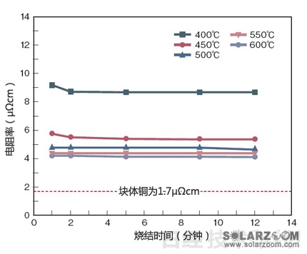在500℃下燒結(jié)1分鐘燒結(jié)后,銅布線電阻率變?yōu)榕cAg布線同等或更小的5μΩcm左右。即使延長燒結(jié)時間,電阻率也不會上升,因此可在充分防止銅氧化的同時進(jìn)行燒結(jié)(圖2)。另外還證實,調(diào)整燒結(jié)氣體的話電阻率還可降至3μΩcm左右。