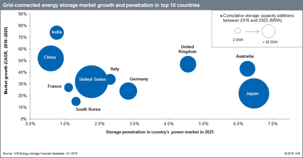 Computerworld 表示,IHS預(yù)測(cè),未來(lái)10年美國(guó)和日本將是最大的儲(chǔ)能市場(chǎng),占到市場(chǎng)營(yíng)收——500億美元(約合人民幣3326億元)的三分之一。到2025年,澳大利亞和日本儲(chǔ)能系統(tǒng)容量將超過(guò)發(fā)電裝機(jī)容量的5%,突顯出儲(chǔ)能系統(tǒng)在電網(wǎng)穩(wěn)定性、再生能源整合和能源管理方面不斷增長(zhǎng)的重要性。