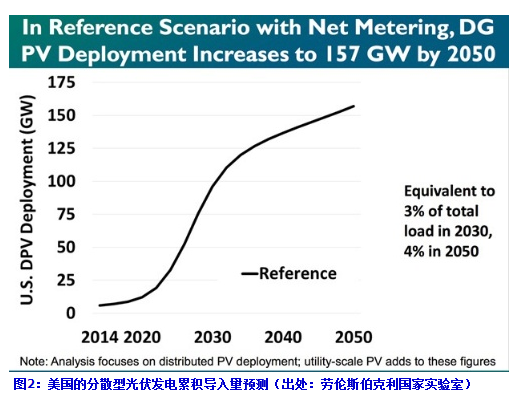 LBNL預測,如果繼續(xù)應用現(xiàn)在的與零售電力為同等價格的凈計量電價制度,美國的分散型光伏發(fā)電市場(與配電網(wǎng)連接的住宅用及商業(yè)、公共、工業(yè)用系統(tǒng))2050年累計將擴大至157GW。相當于美國總電力需求的4%。并以該預測作為“參考值(reference)”,分析了“固定費用回收(電價漲價)”和“按時段收費”兩種制度(圖2)。