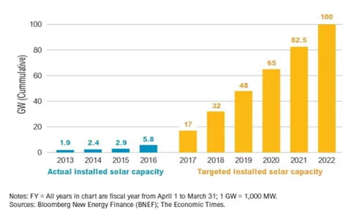 眾所周知,印度是全球用電緊張最嚴(yán)重的國家之一。早在2014年,印度總理莫迪公布了太陽能振興計劃:到2022年,印度要實(shí)現(xiàn)100GW的太陽能裝機(jī)容量,總投資額約8000-10000億元。鑒于印度目前現(xiàn)有光伏裝機(jī)量不到6GW,100GW的目標(biāo)可謂雄心勃勃,來看一下印度政府描繪的路線圖: