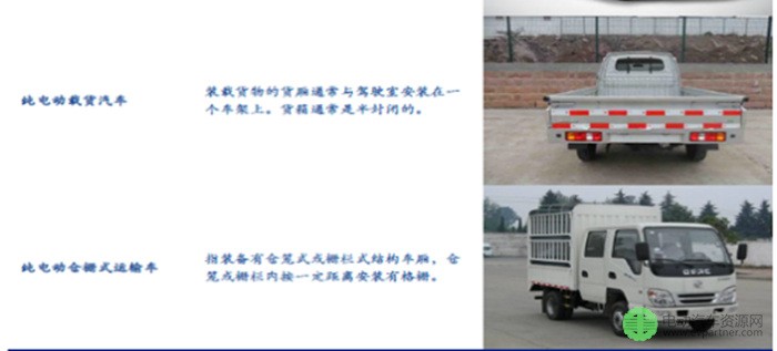 1)按照結(jié)構(gòu)可以分為:純電動(dòng)廂(獨(dú)立、貫通)式運(yùn)輸車、純電動(dòng)(欄板四方桶)載貨汽車、純電動(dòng)倉柵式運(yùn)輸車等。