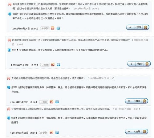 公司在石墨烯超級電容器上前后說法不一,遭投資者譴責“不應該誤導投資者”。有投資者直接向江海股份宣泄憤怒,稱“害了多少無辜的股民,簡直就是吸血鬼”。