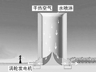 這項技術(shù)的核心是清潔風能吸收塔,它是座摩天大樓大?。ū热纾?00米高)的中空圓柱體,塔頂開口,讓外界的干熱空氣進入。這里裝有水噴淋系統(tǒng),將水泵提送上來的水形成細細的水霧,噴灑到塔頂?shù)恼麄€開放區(qū)域。