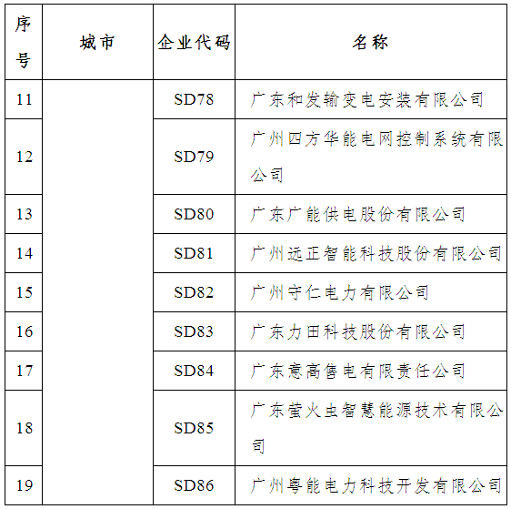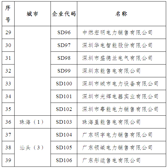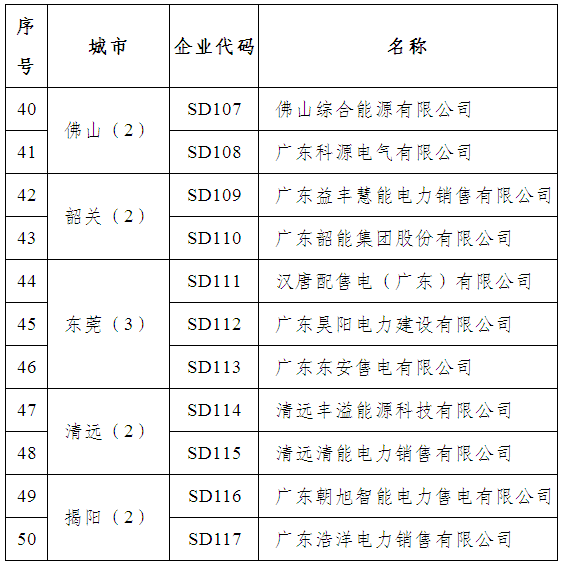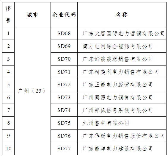 這些企業(yè)有,廣東大唐國際電力營銷有限公司、南方電網(wǎng)綜合能源有限公司、廣東好能能源銷售有限公司、廣東柯美利電力銷售有限公司、廣東正能電力經(jīng)營有限公司、廣州同源電力銷售有限公司、廣州邦訊信息系統(tǒng)有限公司、九州售電有限公司、廣東華暢電力銷售股份有限公司、廣東能洋電力建設(shè)有限公司、廣東和發(fā)輸變電安裝有限公司等50家。