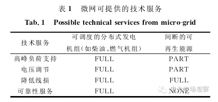 由圖1可看出,集中式電源生產(chǎn)的電力在電力批發(fā)市場(chǎng)的價(jià)格為0.12~0.18元/(kW˙h),而當(dāng)電力到達(dá)終端用戶時(shí)零售電價(jià)達(dá)0.48~0.72元/(kW˙h),電價(jià)提升的原因在于電力從生產(chǎn)到消耗過(guò)程中增加了輸電和配電成本(包括升壓/降壓過(guò)程的設(shè)備運(yùn)行成本、系統(tǒng)安全運(yùn)營(yíng)的相關(guān)成本等)。在圖1所示情境下,若采用微網(wǎng)“就地生產(chǎn)、就地消納”模式,則可省去輸配電環(huán)節(jié)的成本,從而減少終端用戶的電費(fèi)支出,在電力市場(chǎng)環(huán)境下還可降低峰荷時(shí)段輸配電環(huán)節(jié)的電網(wǎng)阻塞成本、輔助服務(wù)成本等。隨微網(wǎng)內(nèi)部交易的增加,微網(wǎng)從外部電網(wǎng)購(gòu)入的電量就會(huì)減少,對(duì)外部配電網(wǎng)的使用率也會(huì)降低,由此配電公司的配電服務(wù)費(fèi)就可能減少。但在實(shí)際運(yùn)行中,配電公司的這種潛在損失可通過(guò)微網(wǎng)為其提供的技術(shù)服務(wù)所產(chǎn)生的經(jīng)濟(jì)效益進(jìn)行補(bǔ)償。這種潛在的技術(shù)服務(wù)包括穩(wěn)定電壓、減少線路損耗及保證供電質(zhì)量等,可由微網(wǎng)中不同類型的機(jī)組承擔(dān)(表1),同時(shí)這種技術(shù)服務(wù)既可在一種強(qiáng)制性協(xié)議的基礎(chǔ)上建立,也可在一定區(qū)域內(nèi)的技術(shù)服務(wù)市場(chǎng)中交易獲得(需在市場(chǎng)化的環(huán)境下開展)。