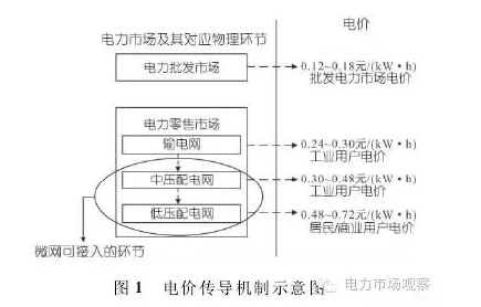 從經(jīng)濟(jì)角度看,微網(wǎng)的收益是通過(guò)整合經(jīng)濟(jì)高效的分布式發(fā)電資源以實(shí)現(xiàn)微網(wǎng)內(nèi)部用戶和發(fā)電主體的直接購(gòu)售電交易,即“就地生產(chǎn)、就地消納”的購(gòu)售電模式來(lái)實(shí)現(xiàn)的,微網(wǎng)的收益來(lái)源于系統(tǒng)內(nèi)外部電價(jià)的差額,見(jiàn)圖1。