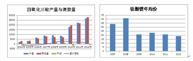 鈷酸鋰的上游原材料主要是四氧化三鈷,據(jù)浙江某大型四氧化三鈷廠商2012年的產(chǎn)量統(tǒng)計顯示,2012年全年其四鈷銷量達5100噸以上,同比增長超過50%,躍居國內首位,在全行業(yè)供應過剩、下游需求放緩的大背景下,四鈷不得不說是個實足的亮點。