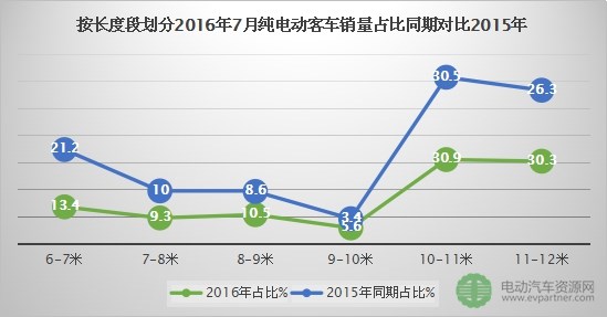 記者整理發(fā)現(xiàn),按長度劃分2016年7月純電動客車銷量占比同期對比2015年變化不是很大,10-12米純電動客車的銷量還是占多數(shù),9-10米純電動客車銷量占比仍然是最少的。