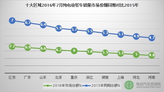 記者整理發(fā)現(xiàn),這十大主流區(qū)域2016年7月份純電動客車市場份額一共占59.3%,同期對比2015年,2015年7月份這十大區(qū)域純電動客車市場份額占57.2%。