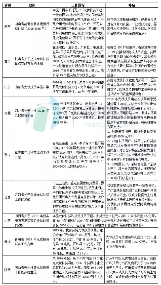緊跟國(guó)家政策,各省也紛紛出臺(tái)了光伏扶貧相關(guān)政策,都根據(jù)本省的特殊情況制定了光伏扶貧的具體目標(biāo)、補(bǔ)貼方式和扶貧模式。