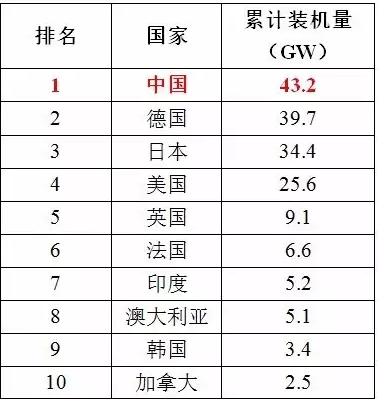 表1:截止2015年底,世界光伏累計(jì)裝機(jī)量前十名