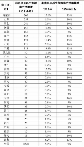 附上2015年各省的非水電可再生能源電力的發(fā)電量和消納比重情況,以及我國(guó)到2020年的目標(biāo)。