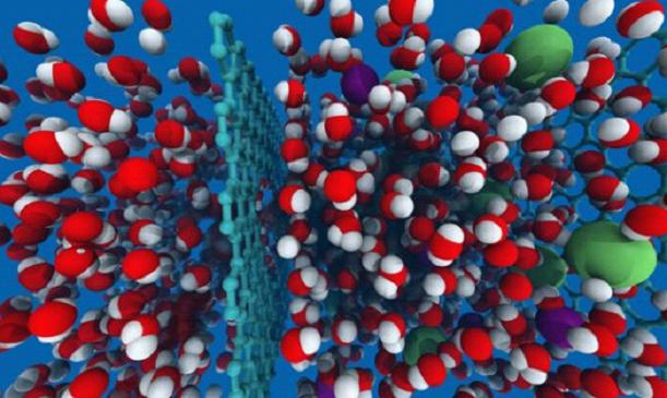 當(dāng)水分子(圖中的紅色和白色)、鈉和氯離子(圖中綠色和紫色)面對一張石墨烯(圖中心處淡藍(lán)色的),只有適當(dāng)尺寸的粒子能從石墨烯的孔隙穿過,即水能通過,而鹽類的鈉和氯被擋住了。