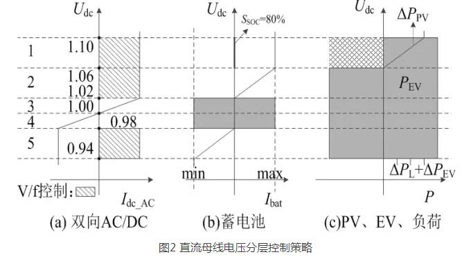 直流微網(wǎng)中直流母線電壓是反映系統(tǒng)內(nèi)功率平衡的唯一指標。本文設(shè)計了直流母線5層電壓(分層)協(xié)調(diào)控制策略,它根據(jù)直流母線電壓的分層下垂變化,實現(xiàn)各變換器之間的協(xié)調(diào)控制,從而實現(xiàn)直流微網(wǎng)中功率的協(xié)調(diào)優(yōu)化分配。圖2為直流母線電壓分層控制策略。圖中,直流母線電壓共分為5層,每層對應(yīng)有相應(yīng)變流器的電壓下垂控制,以保證系統(tǒng)中的功率平衡。其中:第1層控制,系統(tǒng)功率過剩,由光伏發(fā)電系統(tǒng)單向DC/DC變換器降功率控制維持直流母線功率的平衡并提供電壓支撐;第2、5層控制,由蓄電池儲能通過雙向DC/DC變換器電壓-電流下垂控制,維持母線電壓的穩(wěn)定;第3、4層控制,由雙向AC/DC變換器通過與交流側(cè)功率的交換,實現(xiàn)直流母線電壓的穩(wěn)定控制。