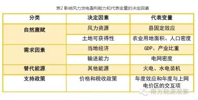 具體邏輯如下:假設(shè)風(fēng)電投資者像市場上其他市場主體一樣,追求利潤最大化,因此他(她)選擇具有最高投資回報(bào)率的投資地區(qū)建立風(fēng)電場。而從區(qū)域?qū)用嫔蟻砜矗粋€(gè)地區(qū)風(fēng)力裝機(jī)量存在一個(gè)均衡水平(equilibrium),該水平取決于影響風(fēng)電場盈利能力的一系列因素(表2),包括1)資源稟賦情況,如風(fēng)力資源、土地情況會影響風(fēng)電生產(chǎn)成本;2)本地經(jīng)濟(jì)發(fā)展情況、電網(wǎng)情況,這些因素會影響風(fēng)電需求;3)替代性能源;4)風(fēng)電支持政策。為了探究支持政策可能對不同地區(qū)產(chǎn)生不同影響,我們根據(jù)風(fēng)電上網(wǎng)標(biāo)桿電價(jià)區(qū)將所有的縣分為四個(gè)區(qū)域。